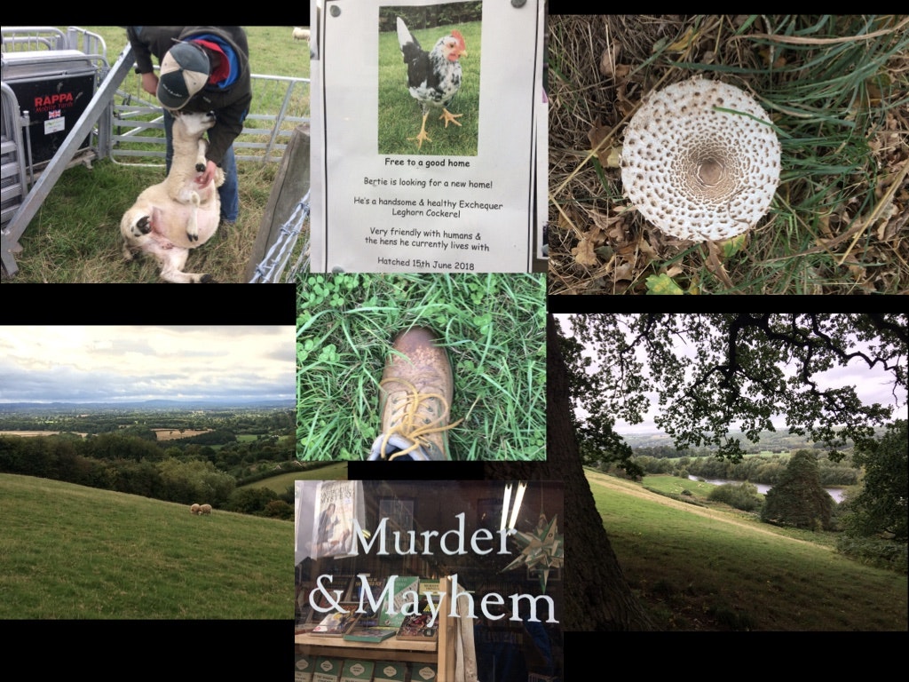 great lorries carrying lambs to the slaughter. Not sure about Hay on Wye, very twee and very expensive (£5.50) for a capuchino and a cake) and full of bookshops - who knew? - but the newsagents noticeboard has lambs for sale and Someone is looking for a loving home for their fine cockerel. The hill above the town is called Lord Herefords knob. Other views - the Brecon Beacons and Black Mountains. The salmon weighed 50Ib - they were common in those days and the Wye built its reputation on such monsters.