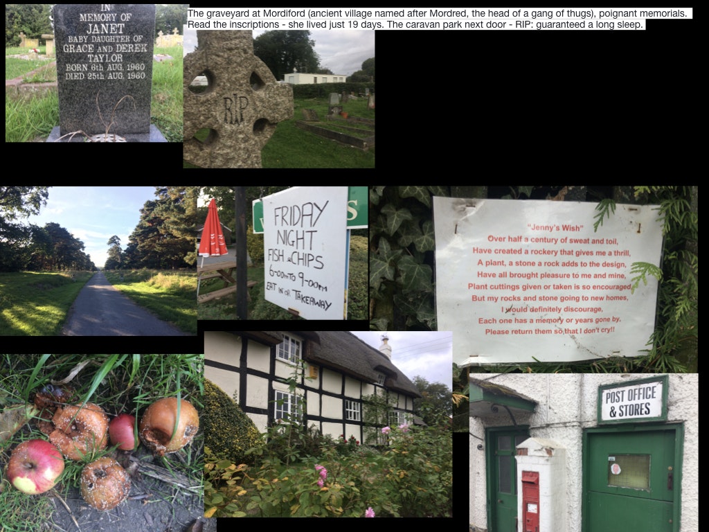 Cider apple orchards...that’s all I can remember after 22 miles of exhaustion and exaltation. Love the notice beside a rockery facing the road. Glorious last two hours of evening sunshine bathing the country estate I walked through. Herefordshire is full of wonderful dwellings from the downright quirky to huge houses and the ubiquitous timber frame homes cloaked in roses…