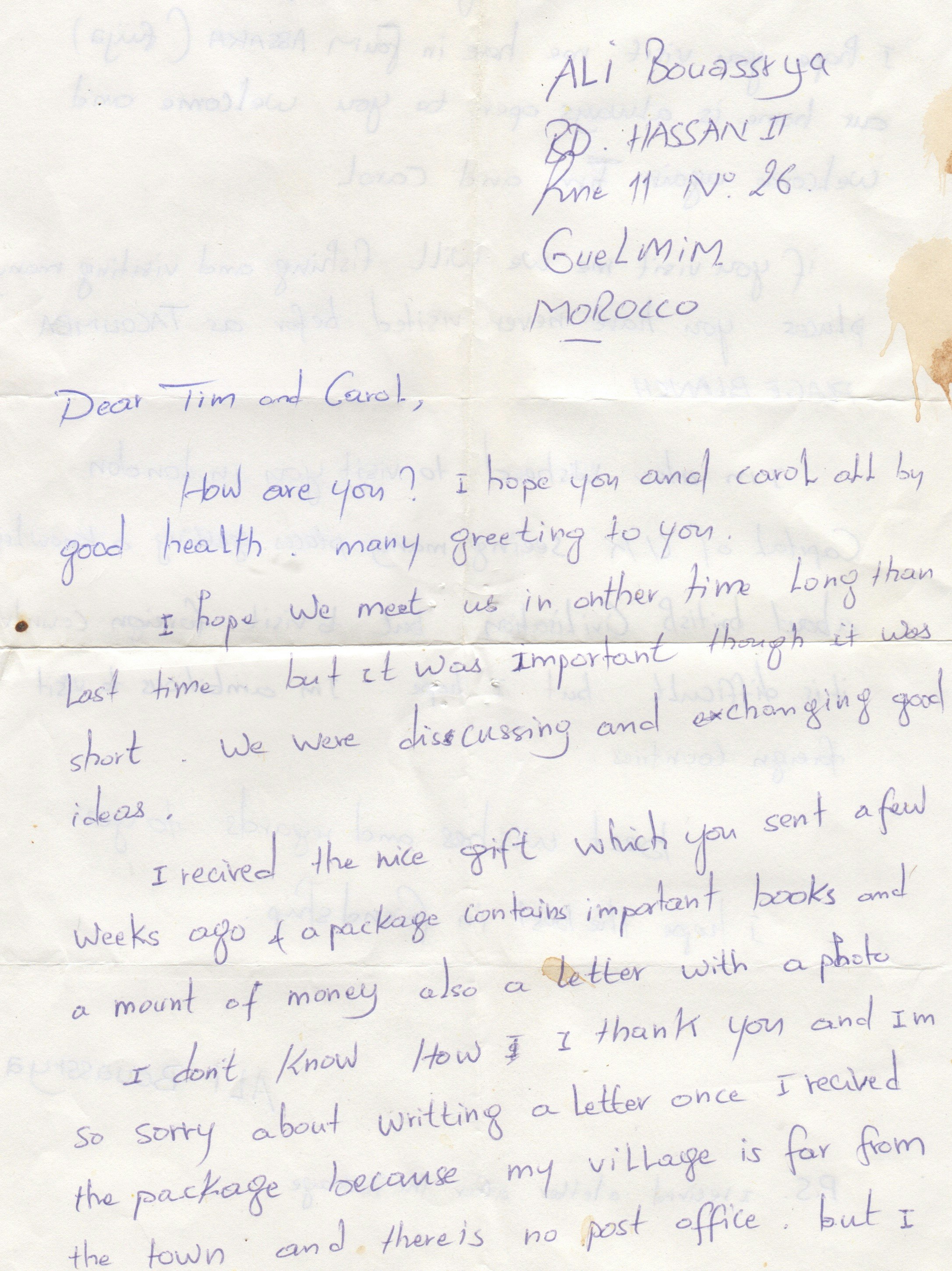The postscript to this story is that we collected books and materials for him that would further his English education and posted them on. A while later we received a letter from Ali which was really well written. At the end he wrote (and I have reproduced it as he wrote it rather than correct his grammar like a teacher might) -